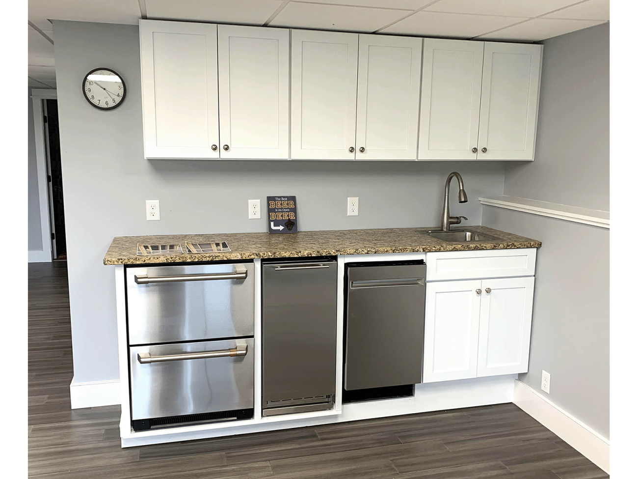 A frontal view of the basement bar that was custom built to accommodate the small appliances, such as mini fridge and dishwasher. New Cabinets are featured as well.