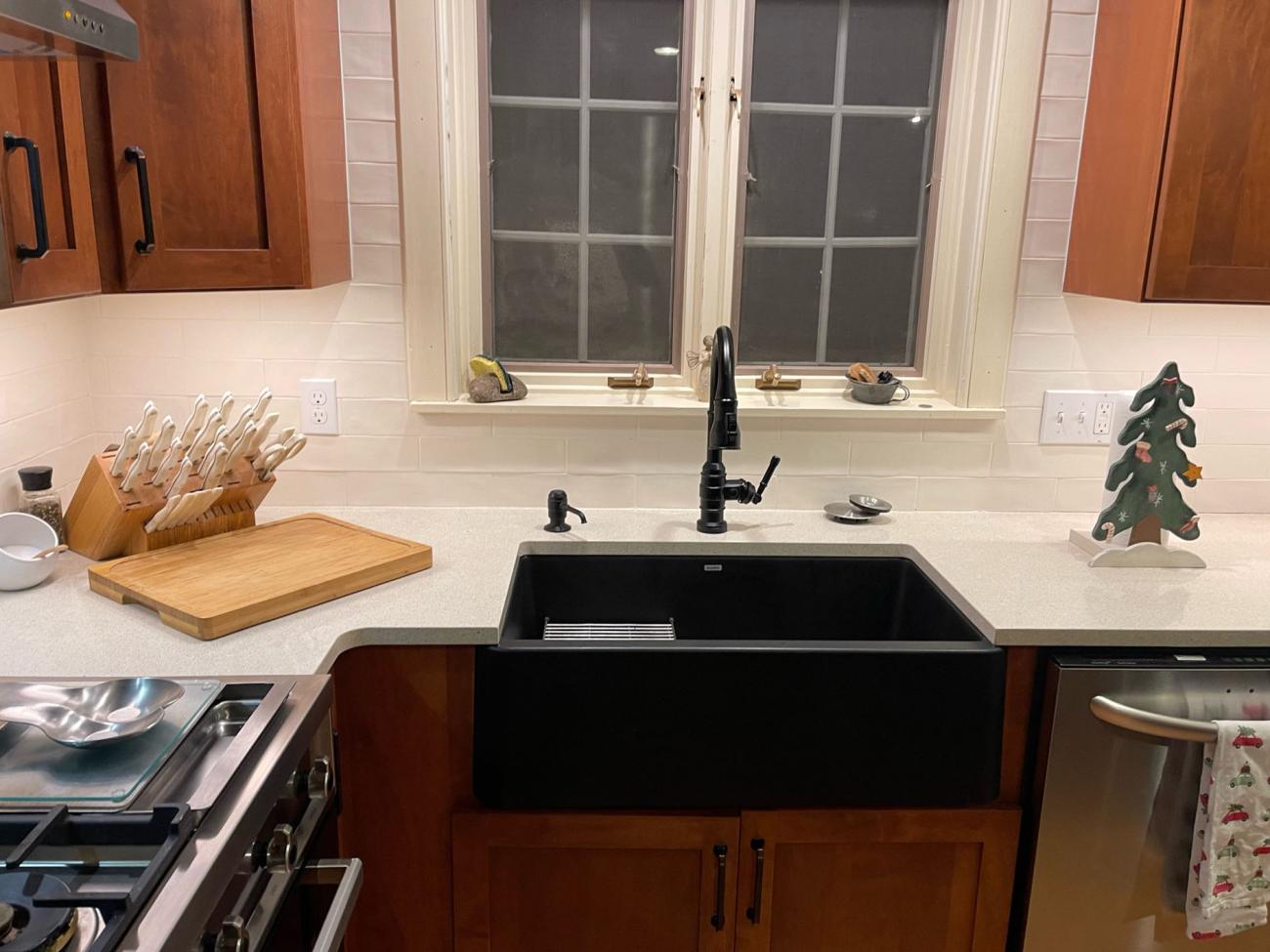 Kitchen remodel with island and new apron sink. Electrical, appliances, and plumbing improvements also completed here.